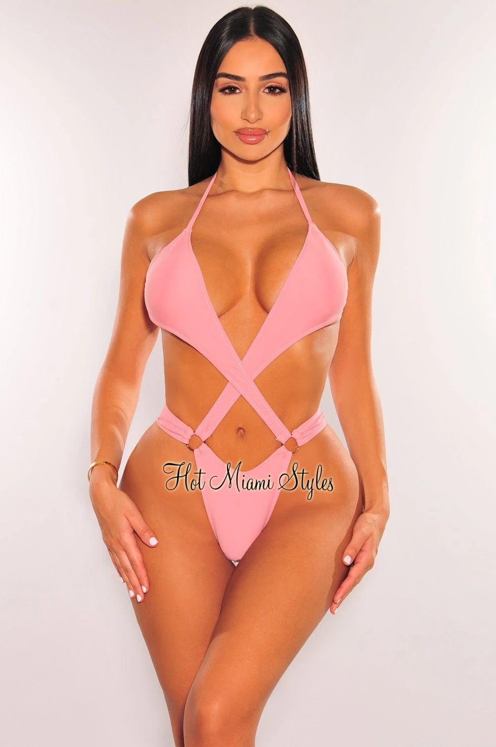 Feel like the goddess you are when you lay under the sun in our baby pink one piece swimsuit. Made with a halter neckline with cut out and o-ring design.Â