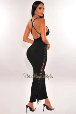 Black Crochet Halter Tie Up Back Slit Cover Up Dress