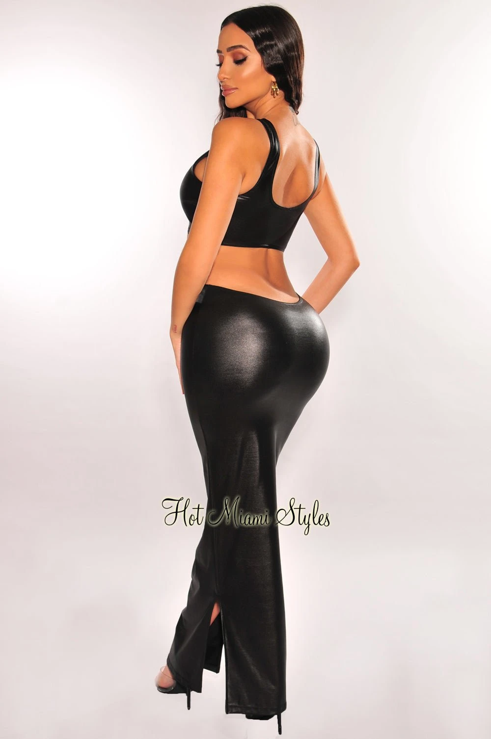 Leave them speechless in this edgy faux leather cut out dress. Designed with a sexy V neckline with O-ring detail and sultry side slits.