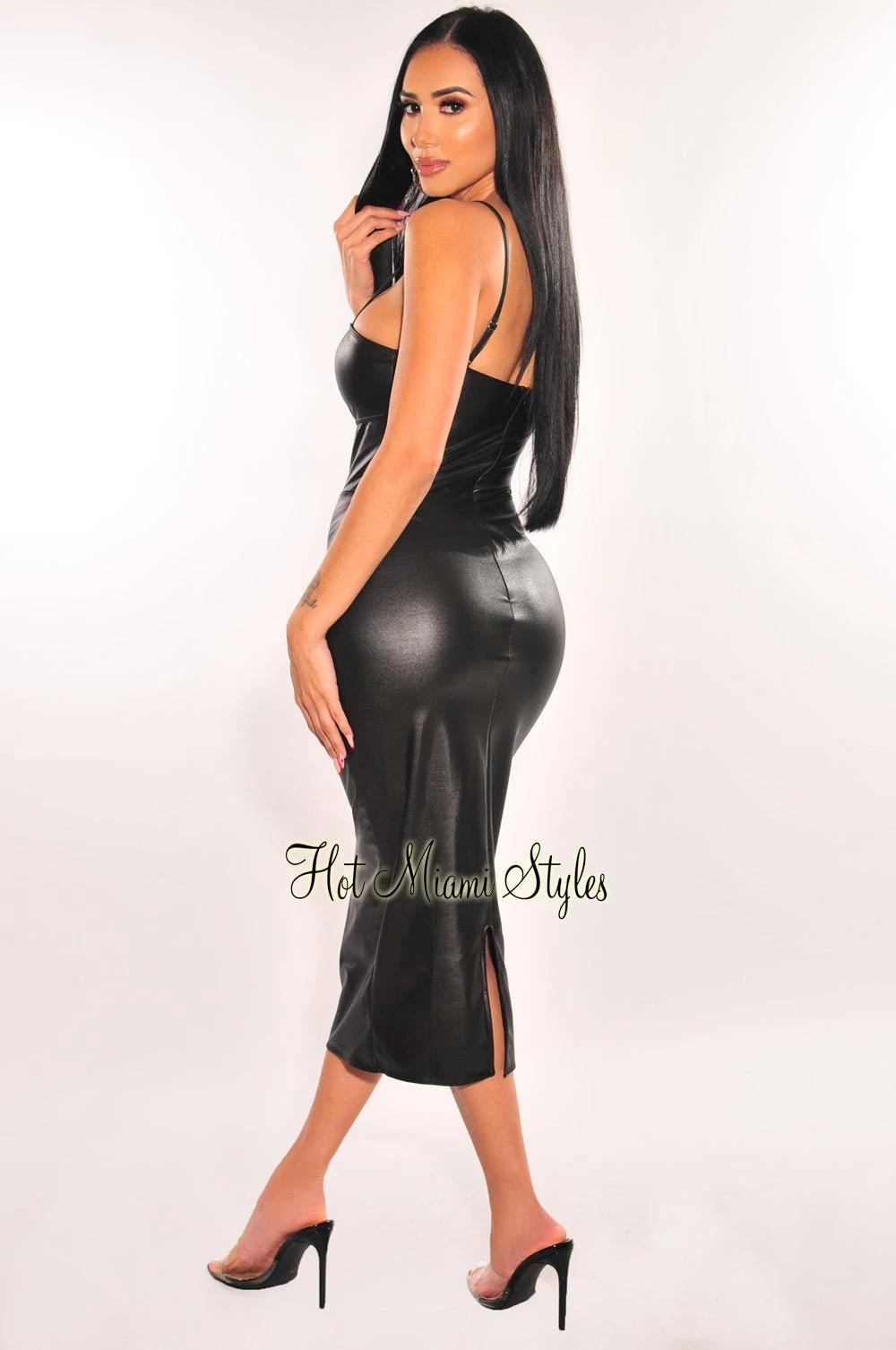 A total sultry look just for you babe! Made of sexy faux leather and knotted cut out details on a midi length dress.