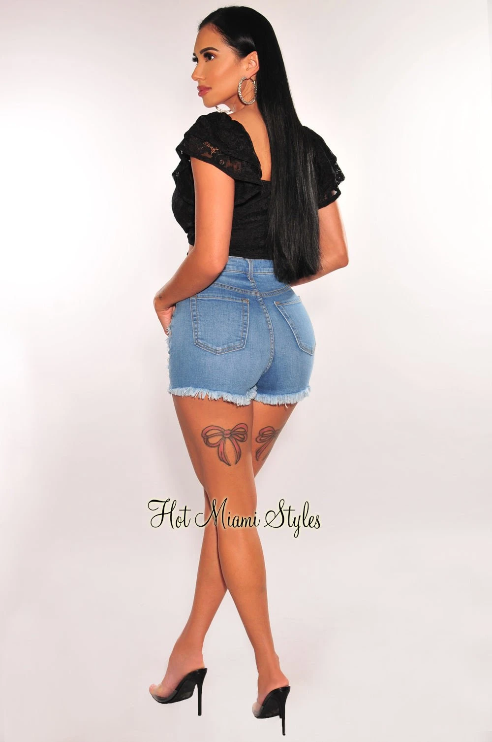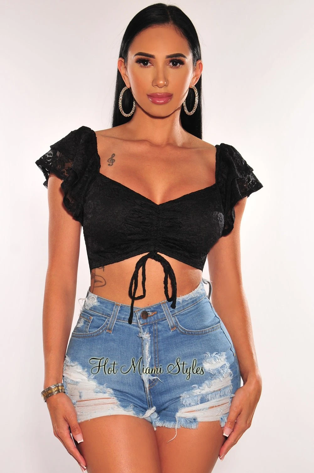 Black Floral Lace Ruffle Sleeve Tie Up Ruched Crop Top