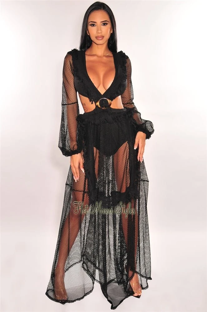 Staycay or vacay? This black fringe cut out dress is everything you need. Features a fishnet detail with a lace up open back and long sleeves.