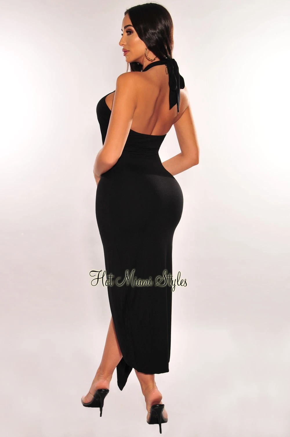 Black Halter Crisscross Cut Out Drape Ruched Slit Dress