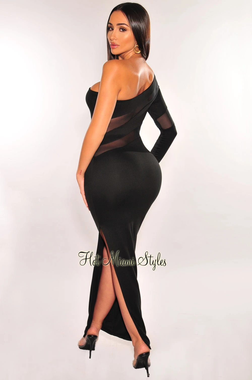 Ready to show off your feminine curves? Featuring a one sleeve design, black mesh detail on a chic midi length.