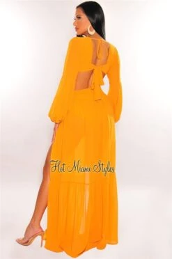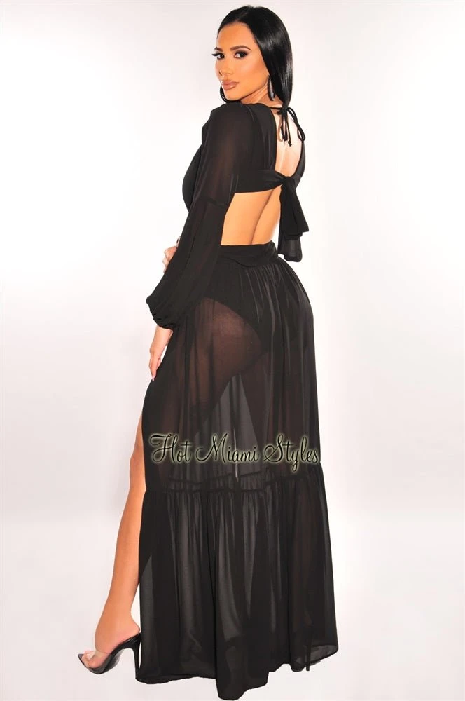 Black Mesh V Neck Cut Out Long Sleeves Double Slit Maxi Dress