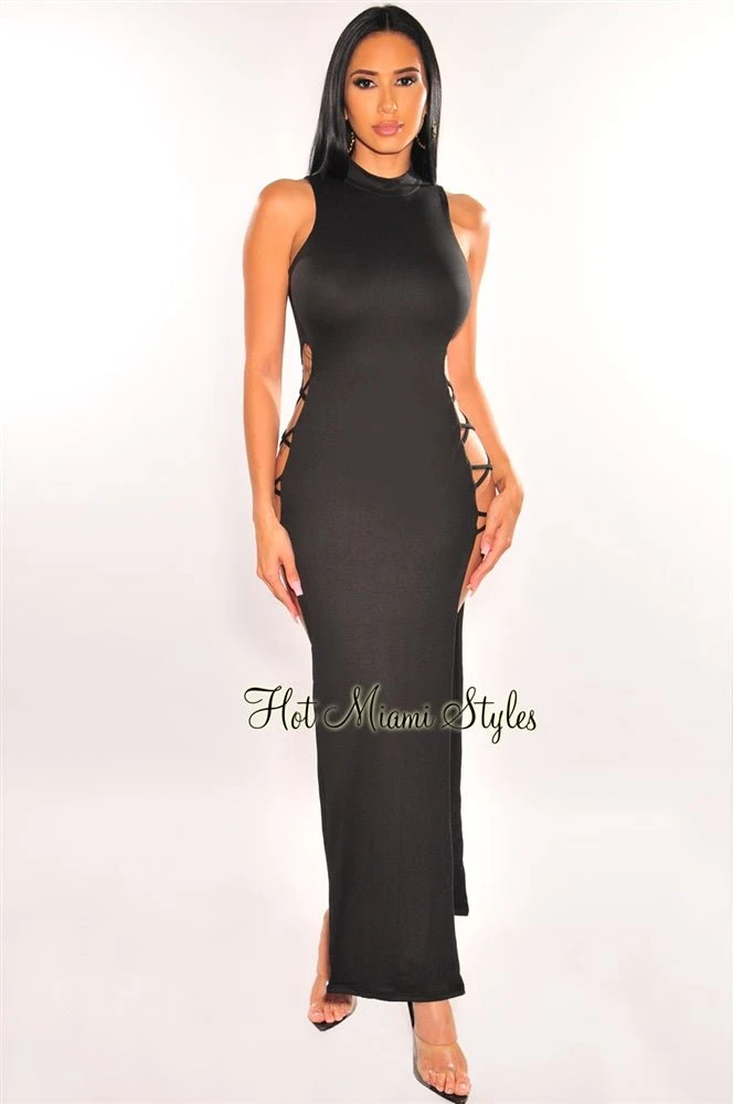 Slip right in this sexy bodycon slit lace up dress. Made to hug and mold your body on a mock neck design with double side slits featuring sultry lace up details.