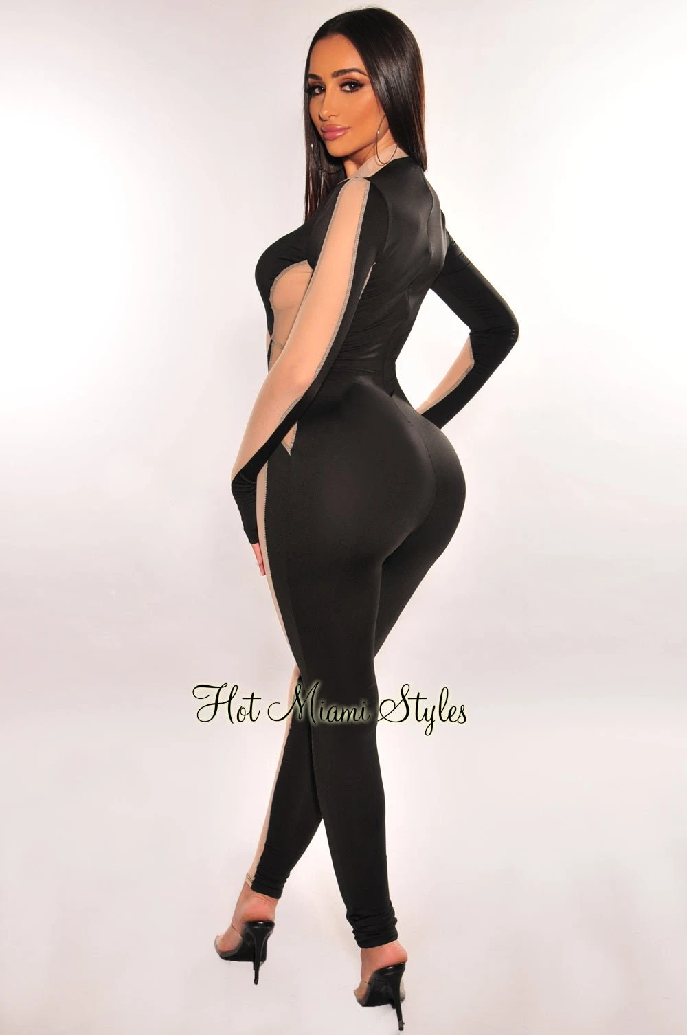 Amp up your jumpsuit collection in this black jumpsuit. Made with a mock neckline, long sleeves and sultry nude sheer mesh detailing.