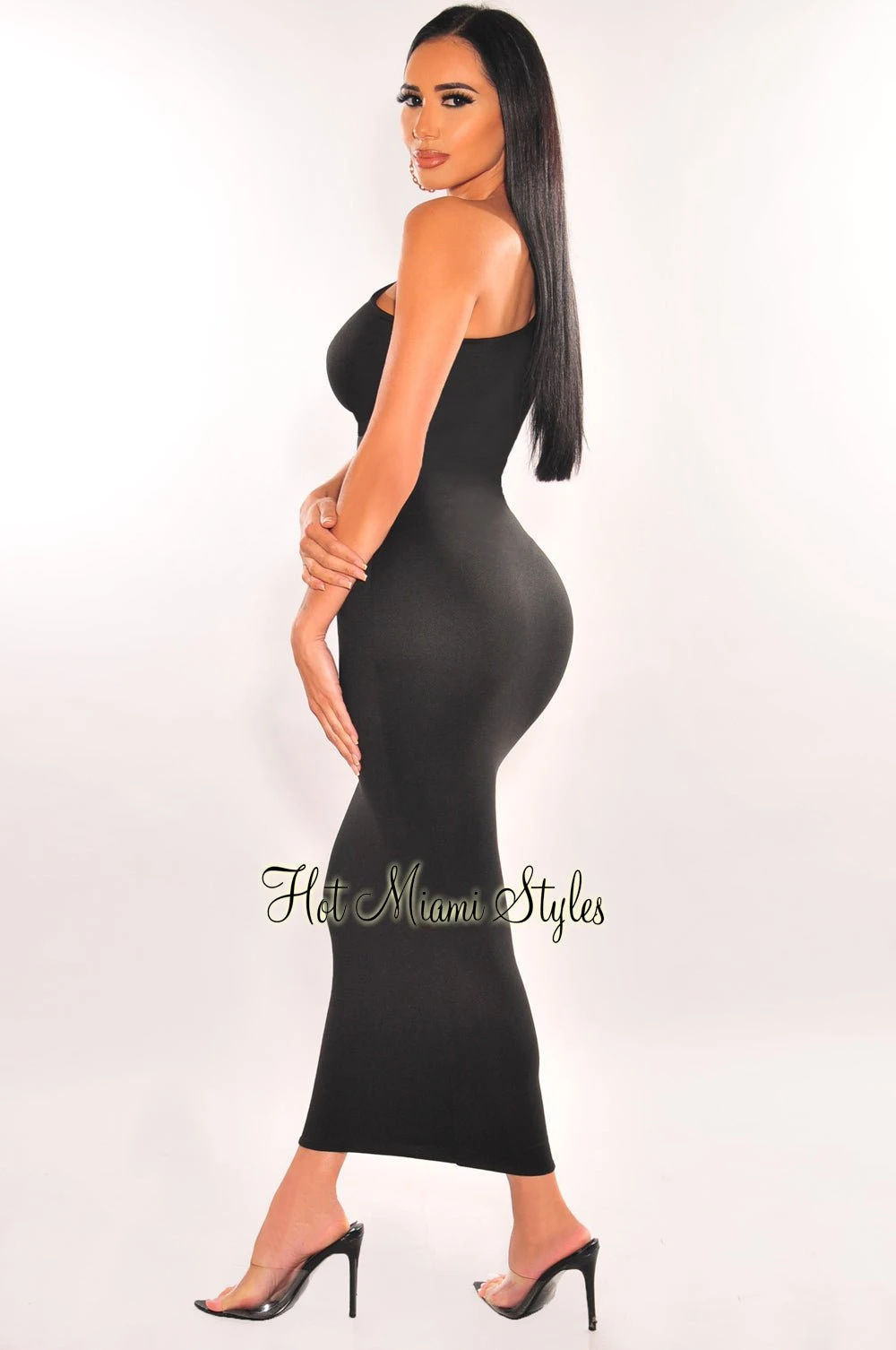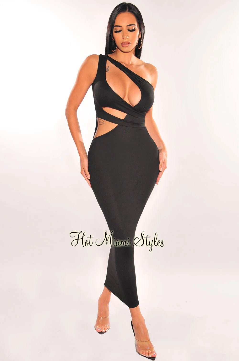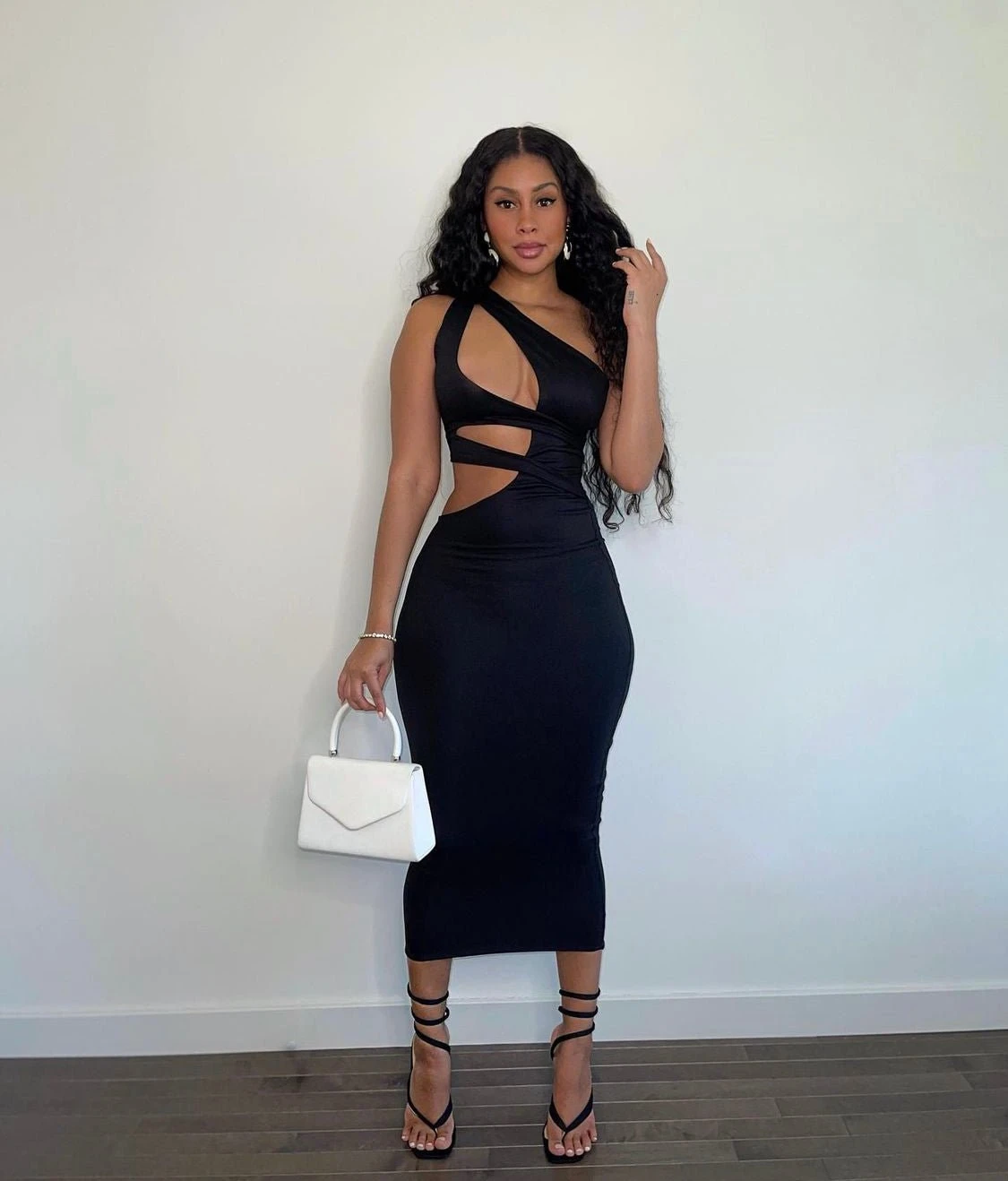 The ultra curve-hugging fit you have been searching for. Made with a one shoulder neckline, cut out design on a midi silhouette. This is one dress you’ll want to own for nights out.