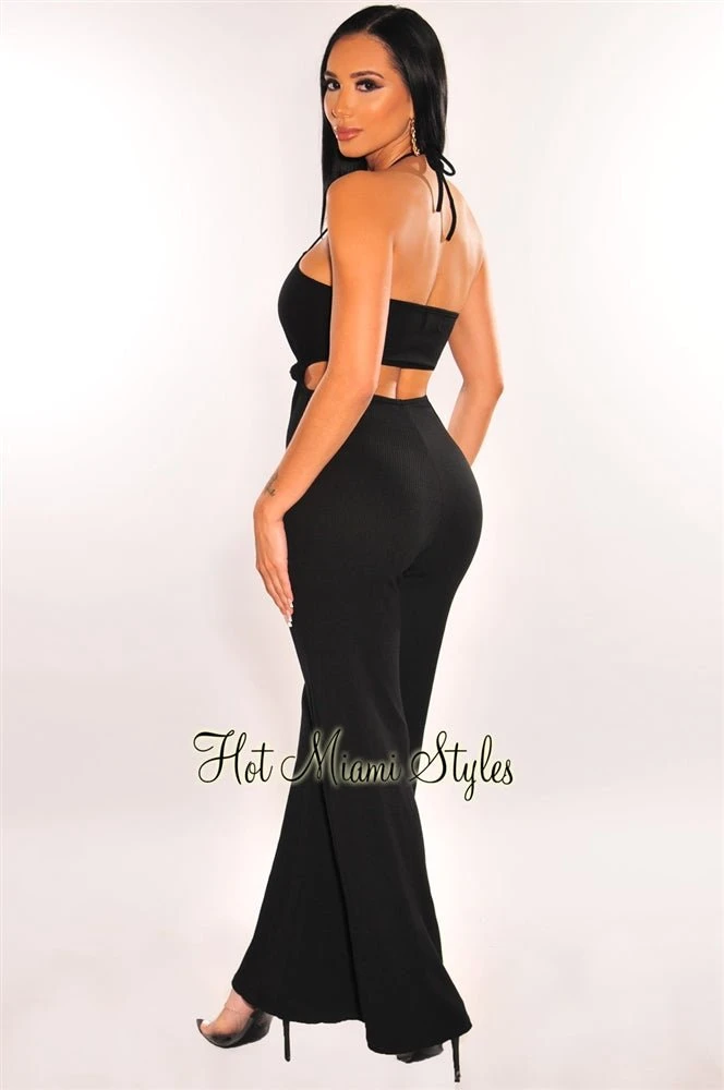 Showcase classy yet sultry looks in this black jumpsuit. Made with an appealing knotted cut out design and palazzo wide leg fit. Style with your favorite accessories for the perfect look.