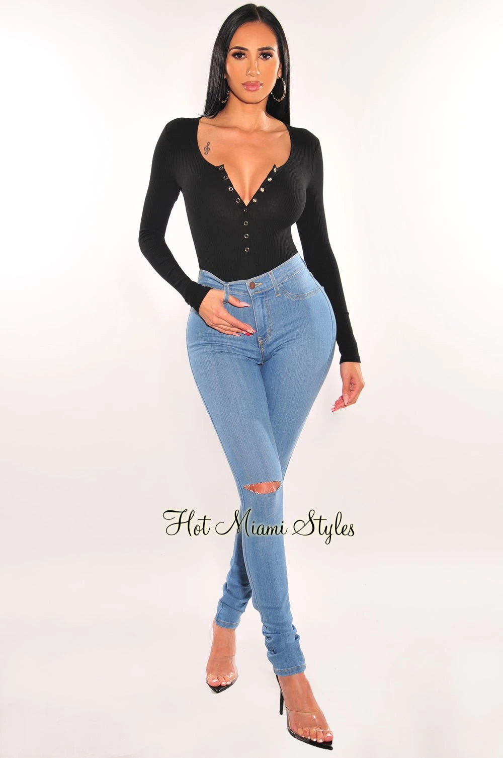 Add some essential to your basic with this bodysuit made of ultra-supportive, ribbed fabric designed to fit like a glove on long sleeves and snap button up detail. Pair with your favorite HMS bottoms.