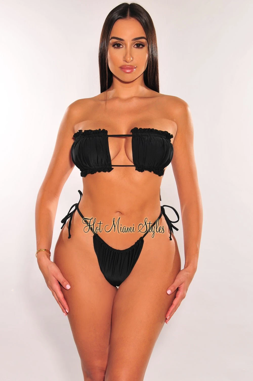 Deliver fun stylish vibes in our bust frill padded bikini. Made with ruched bodice bust in a bandeau style tie up top. Includes matching high rise bottoms with a scrunch butt detail.