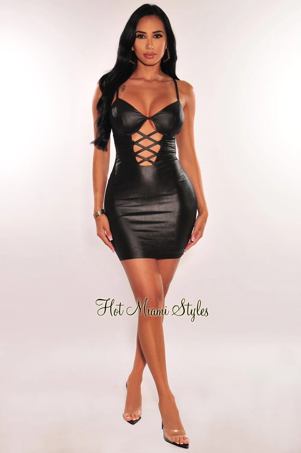 Black Satin Spaghetti Straps Padded Underwire Lace Up Cut Out Mini Dress