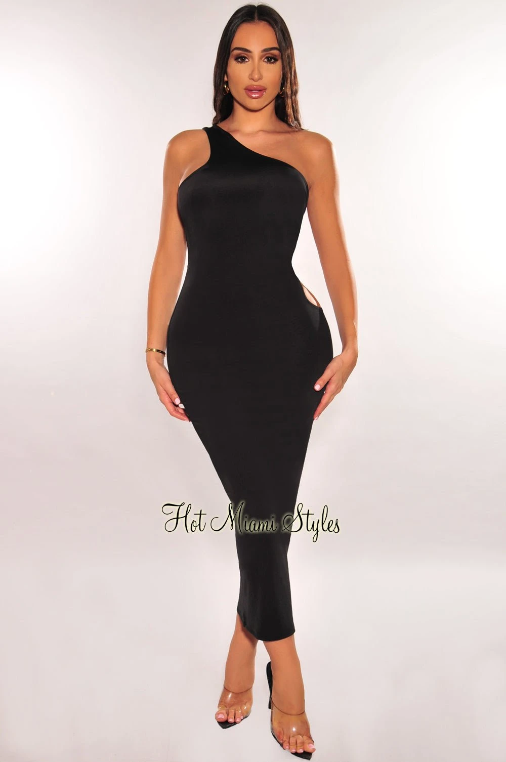 Show off your curves when you wear this black one shoulder silky dress. it’s lace up back design reveals the ultimate chic fit to any event.