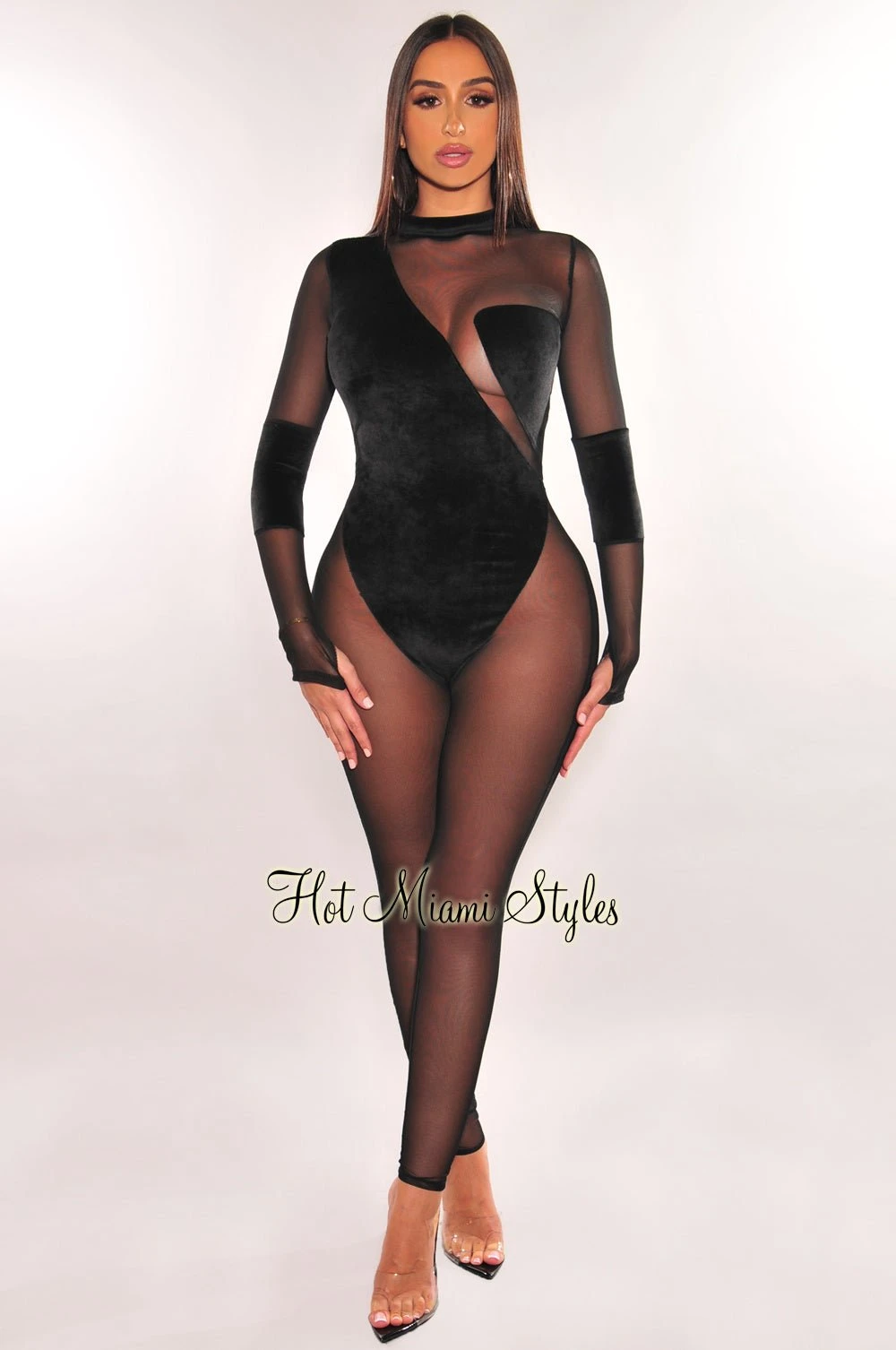 Ensure compliments all night long in the velvet sheer curve hugging jumpsuit. Designed with long sleeves and sultry sheer mesh detailing.