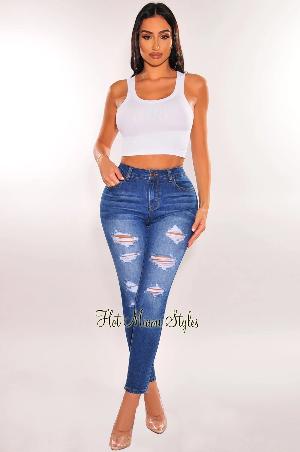 Walk your walk in these sexy ripped skinny jeans. Featuring a high waist , two front pockets, two back pockets, a single button and zipper closure. These stretchy skinnies will hug you right !