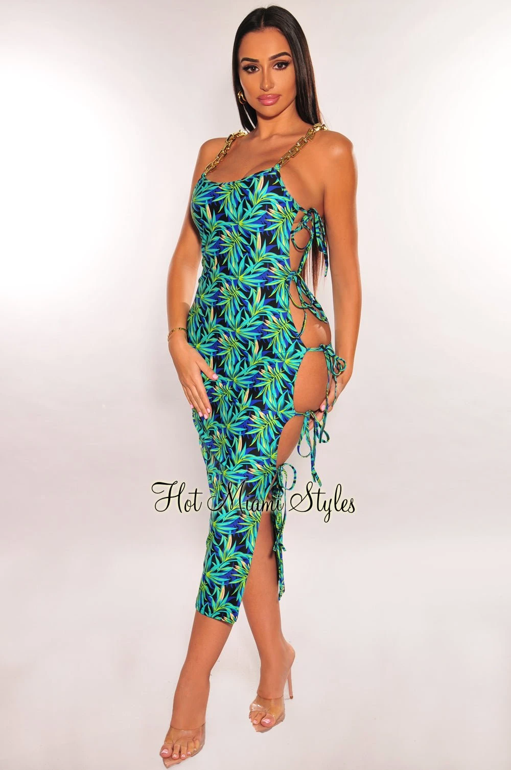 Make a statement in this tropical print dress. Featuring sultry gold chain straps and tie up up sides.