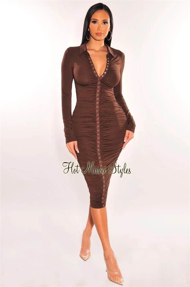 From the office to date night, this midi dress is everything you need. Features a collared neckline and snap button details on the perfect body hugging bodice.