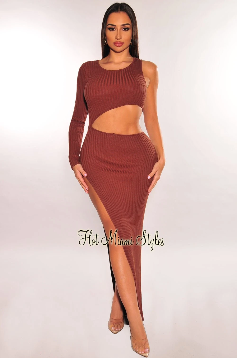 Babe, leave them speechless with this super sexy maxi dress. Made out of the perfect ribbed knit bodice on a one sleeve design, featuring an intriguing cut out and a sultry thigh high slit to complete the look.