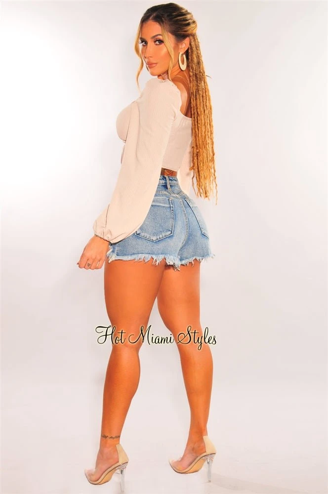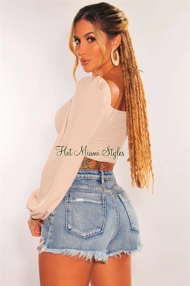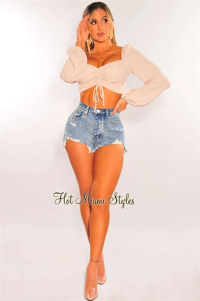 This cute little cream top is perfect for your date night with its bustier-style bodice, padded cups, and puffy long sleeve. Features a ruched drawstring style tie up at bust on a ribbed knit bodice.
