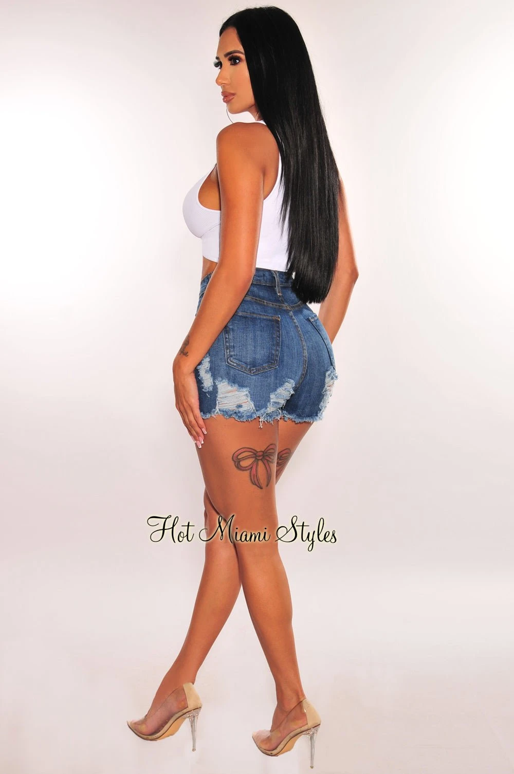 Let your edgy side speak in these dark denim shorts. Features a high waist silhouette and our fave ripped destroyed design that adds the perfect touch.