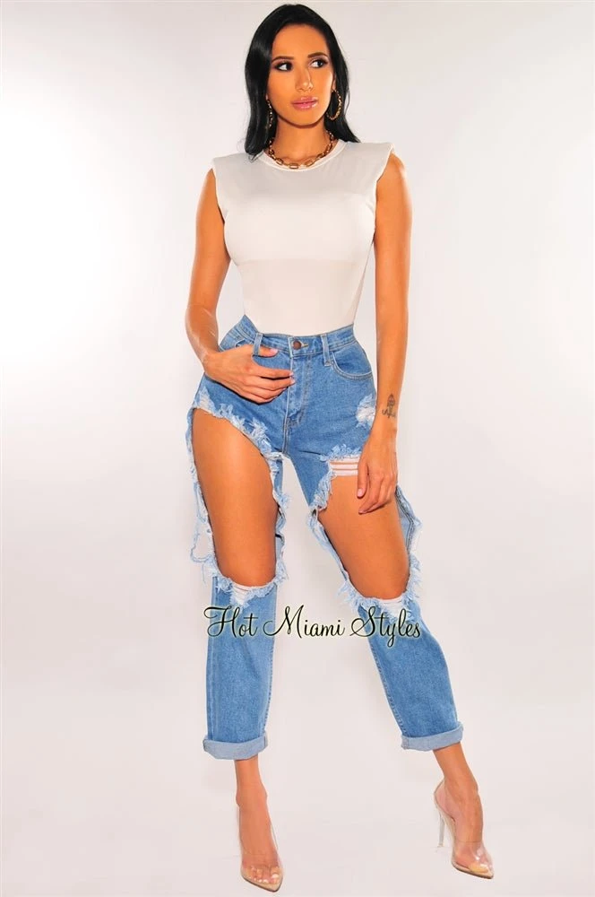 Strut the streets with this fashionable denim ripped destroyed boyfriend jeans. Features a comfy loose fit and made of stretchy denim for an easy fit.