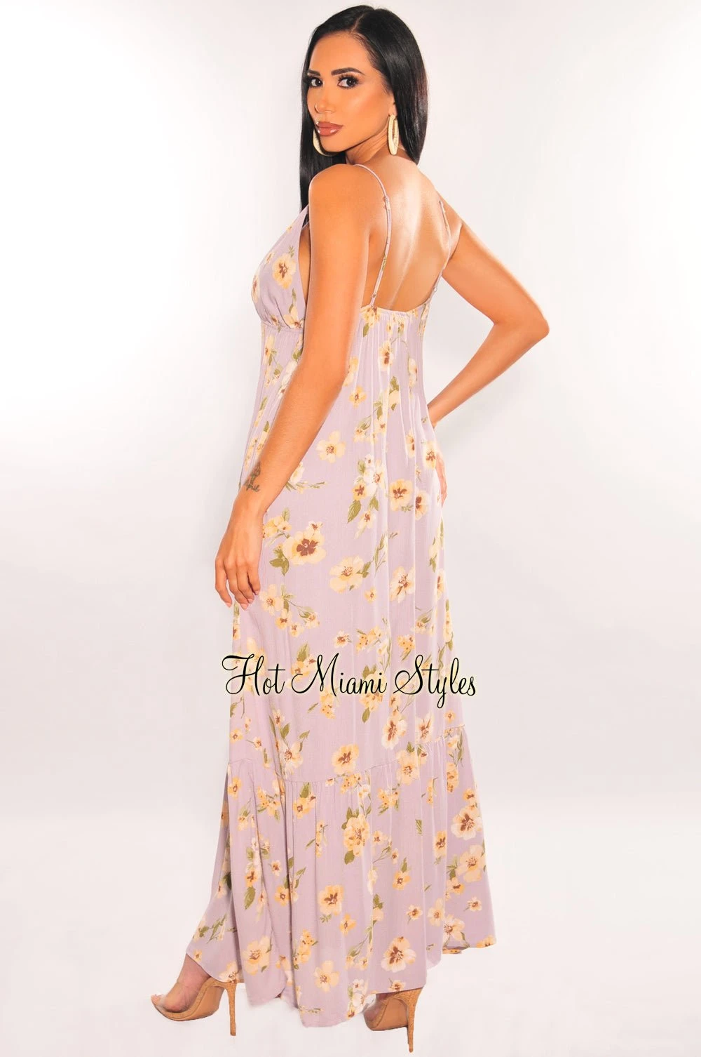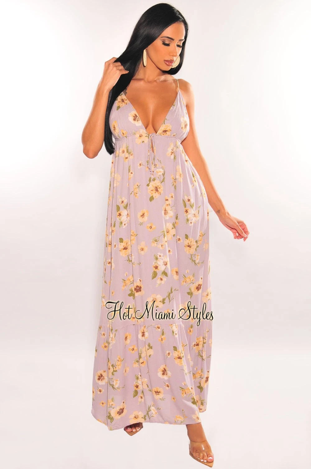 A for-sure vacay essential. Featuring a v neckline, flirty floral print and tie up bust on a flowy maxi length.Â