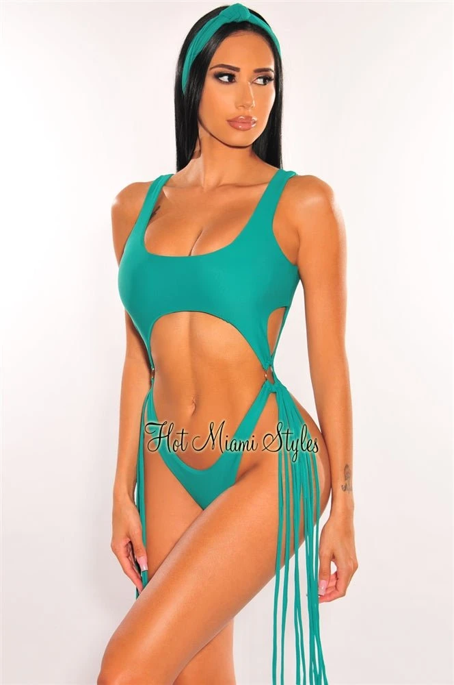 Deliver the hottest looks in our stylish cut out swimsuit. Designed with a super sexy high cut detailed with O-Rings and flirty fringe at sides. Paired up with a matching headband.