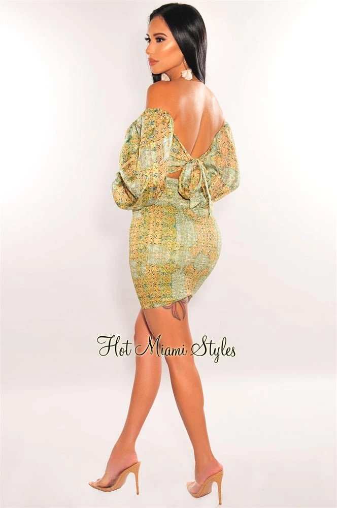 Find the perfect summer look in this green print mini dress. Made with an off shoulder tie up at back design, featuring a smocked bodice to hug your curves.