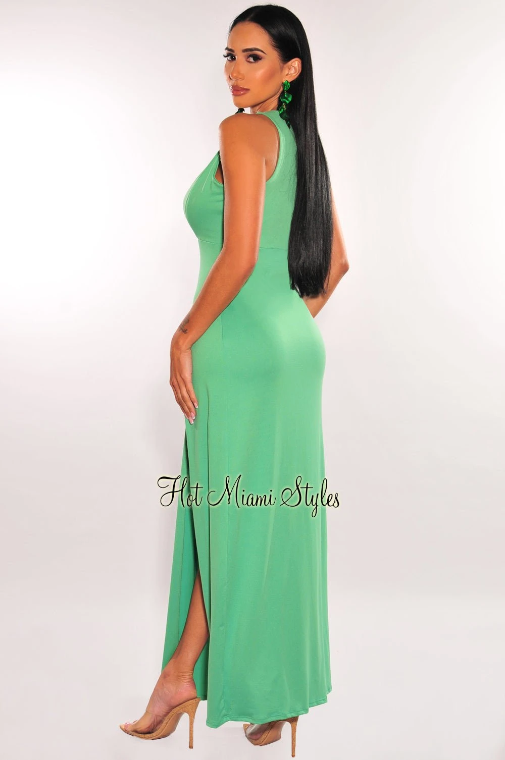Green Sleeveless V Neck Double Slit Cover Up Maxi Dress