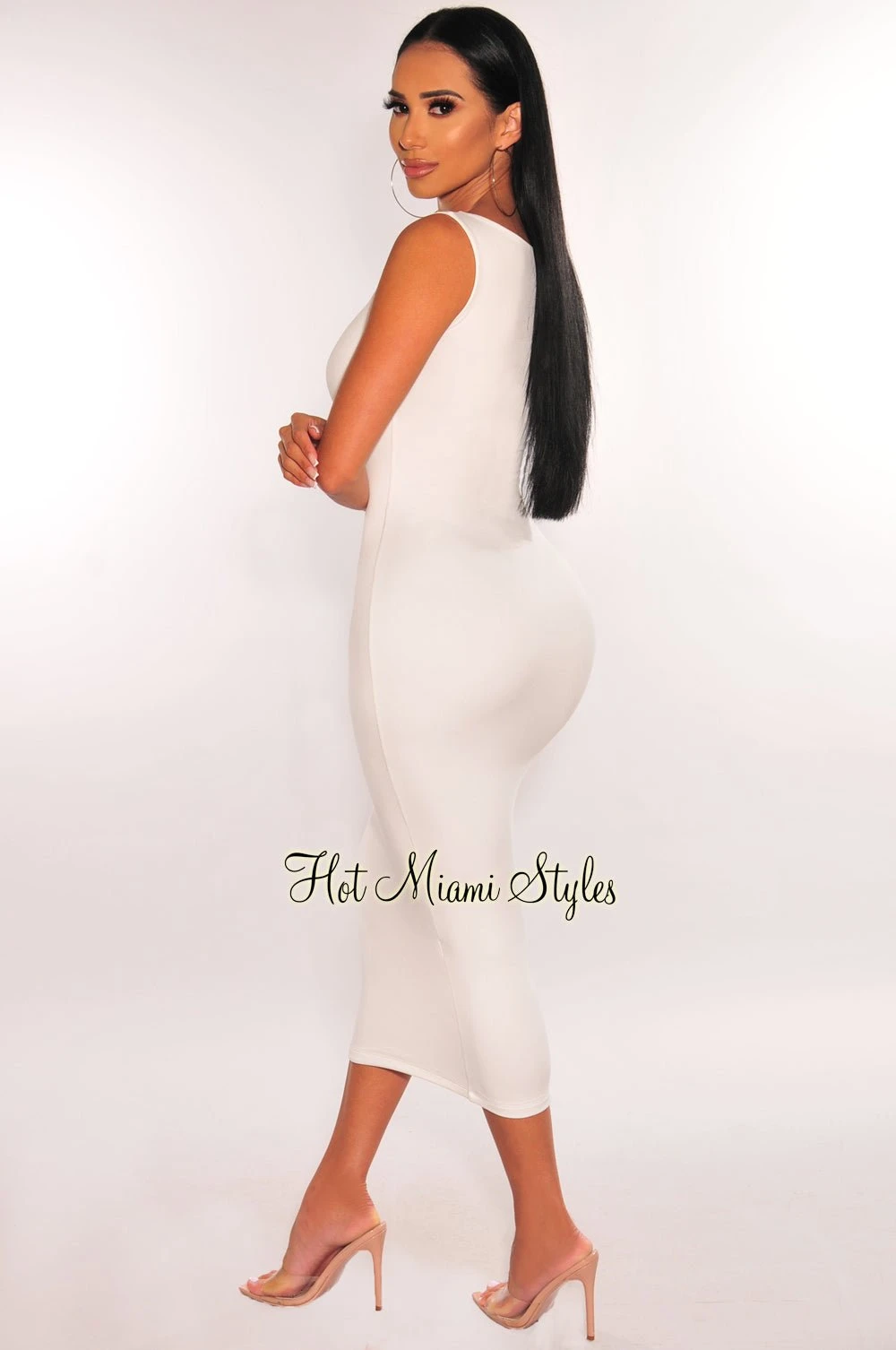 Get that hourglass shape in this must have dress. Features a round neckline and ultra stretchy double lined fabric on a midi length.