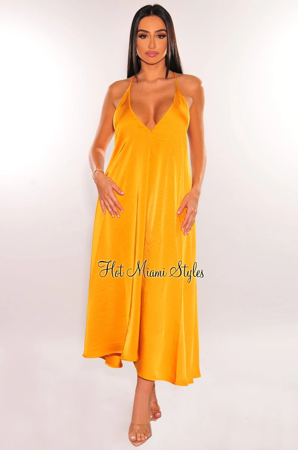 This golden silky dress is everything you need in your wardrobe! Featuring a sultry v neck design and an appealing back design on a perfect maxi silhouette.