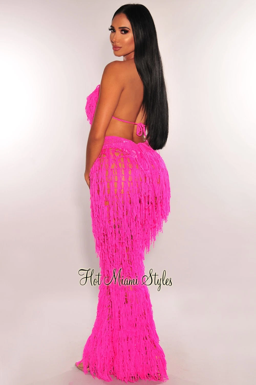 Amp up your vacay looks inĀ our new favorite fringe two pieceĀ cover up.Ā Featuring a halter neckline with crochet details with matching pants.Ā