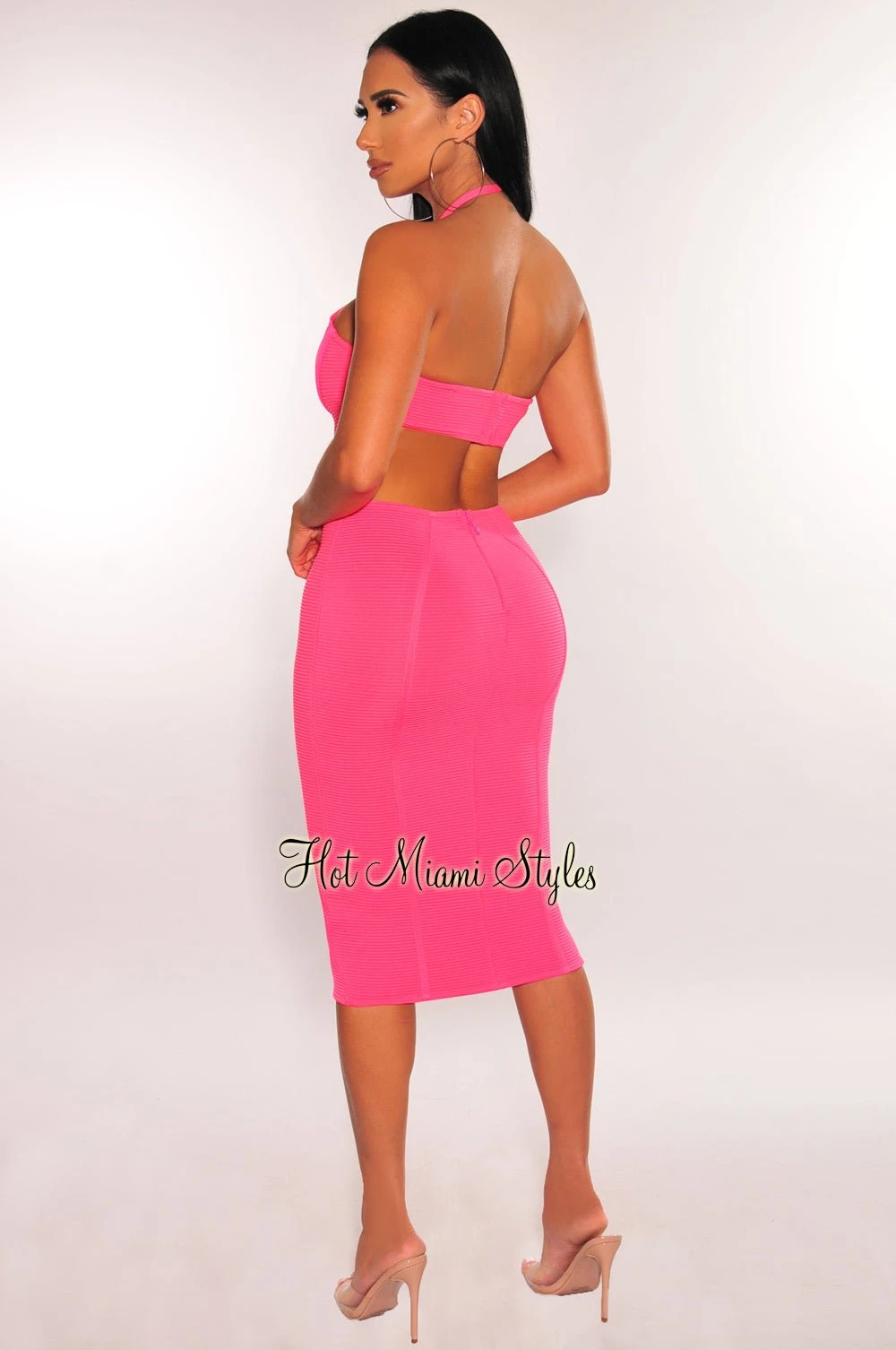 Get ready to party in this hot pink cut out dress. Designed with your curves in mind in a bandage bodice and halter neckline.