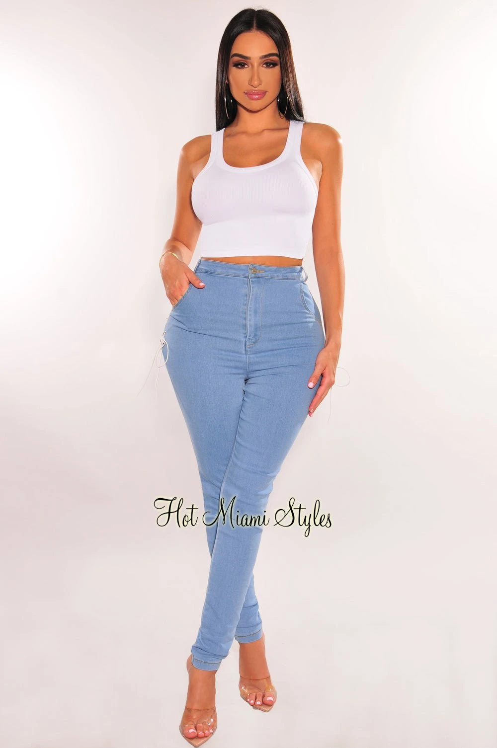 Get ready to make a statement! These light denim jeans feature cut out lace up detailing and are made of ultra stretchy fabric for a perfect fit.