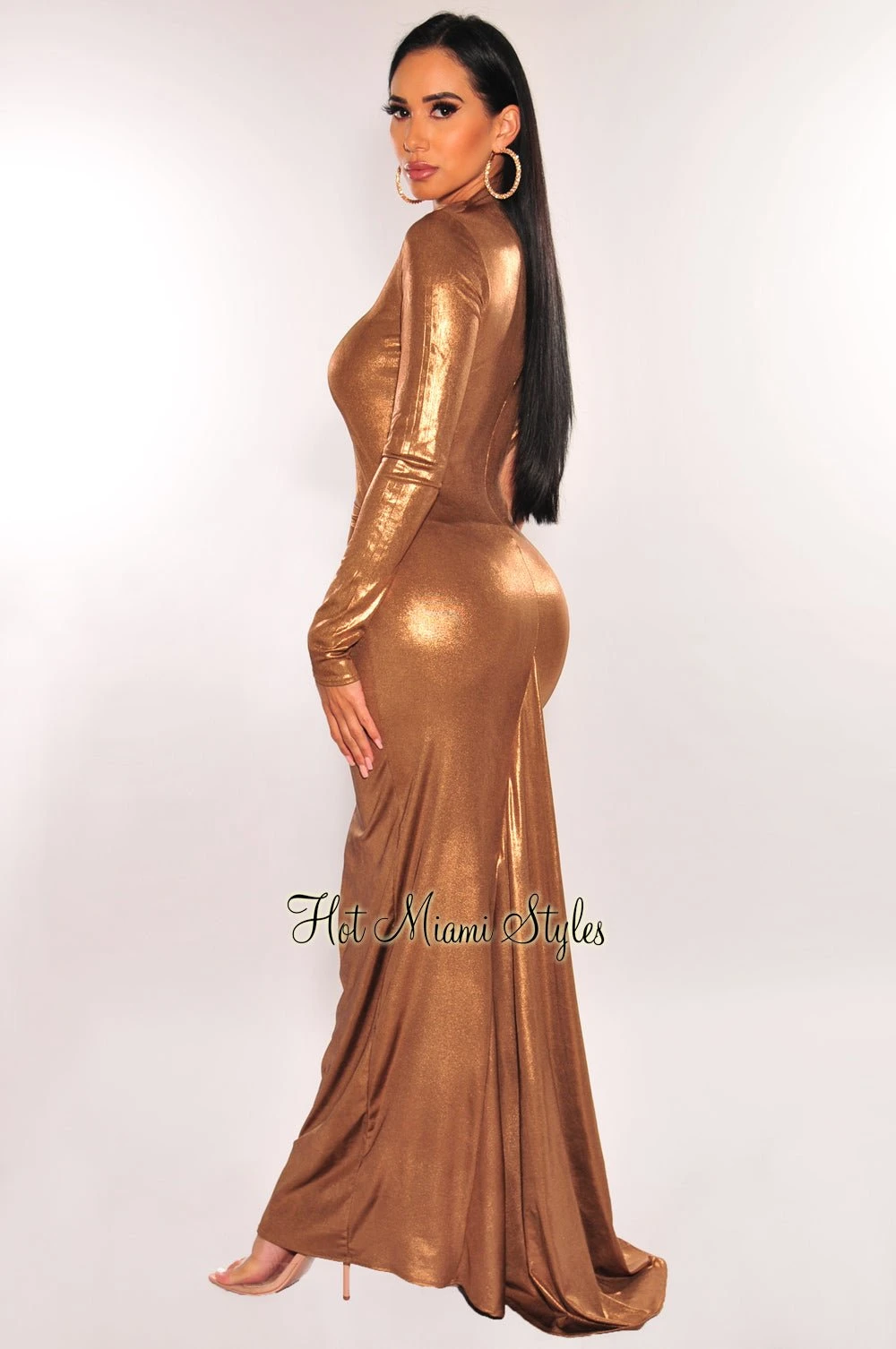 Show out in this celebrity look that will have them all turning heads your way. Featuring an exclusive one sleeve cut out design on a metallic latex bodice with a gorgeous train design.