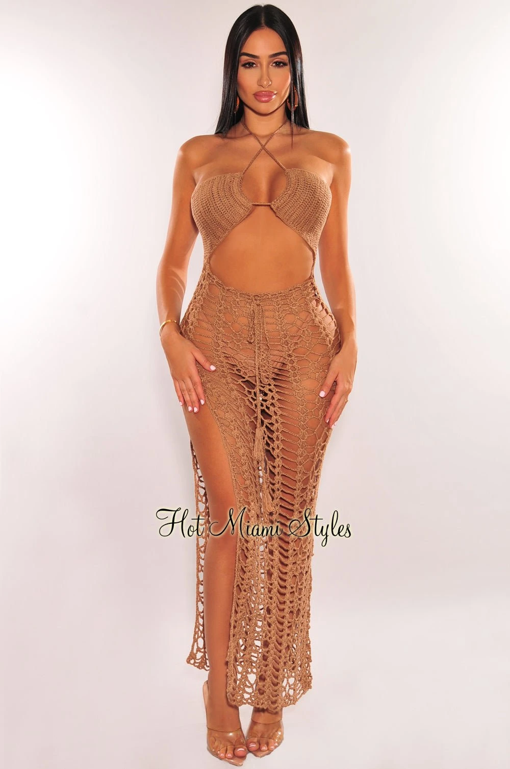 Soak in some vitamin sea with our perfect beach babe mocha cut out crochet cover up dress.