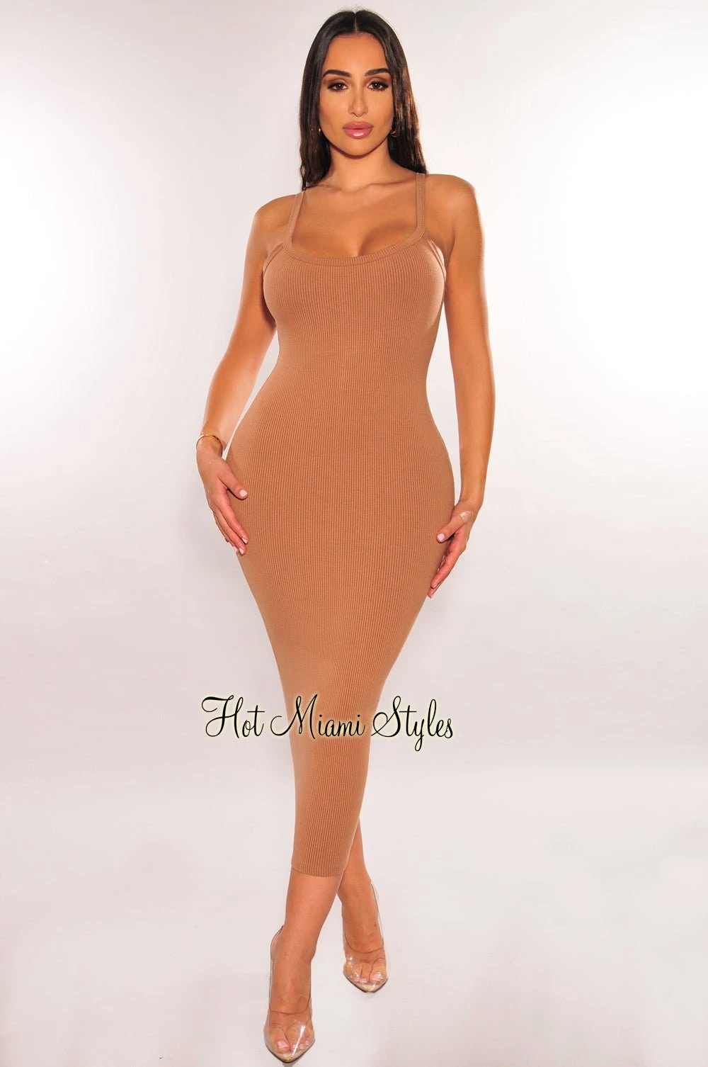 Slip right in this bodycon dress. Made of stretchy ribbed fabric that will hug and shape your body with feminine open back on a midi length.