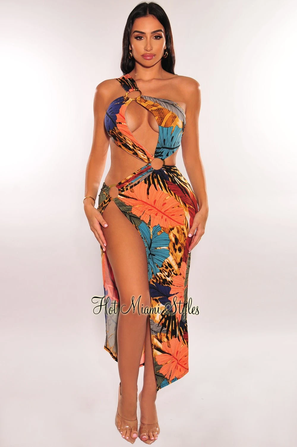 You will feel like a goddess in this one shoulder multicolor tropical print cut out dress. Features a cut out bodice and an O-ring detailing with slit to add a sultry touch to your look.