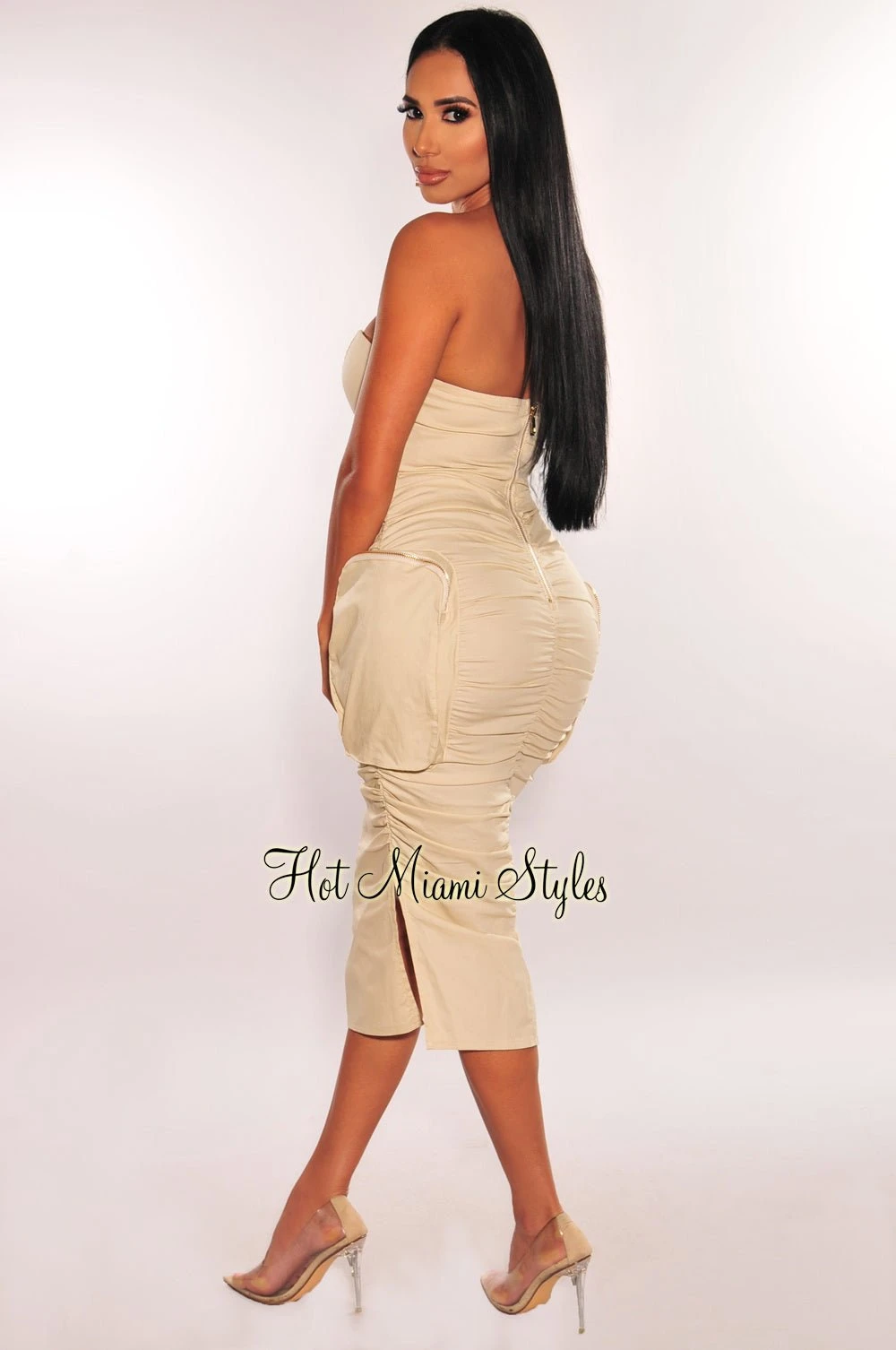Designed with you in mind. Features a strapless neckline with a boning corset style and ruched cargo details. Day or night, this dress will become your go-to.