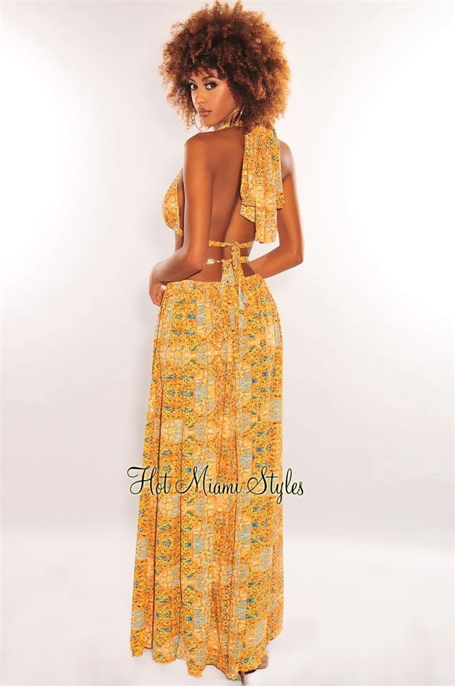 Leave them speechless in our beautiful maxi dress. Designed with a fun print on a halter neckline with a tie up gold detailed belt and sexy thigh high double slits.
