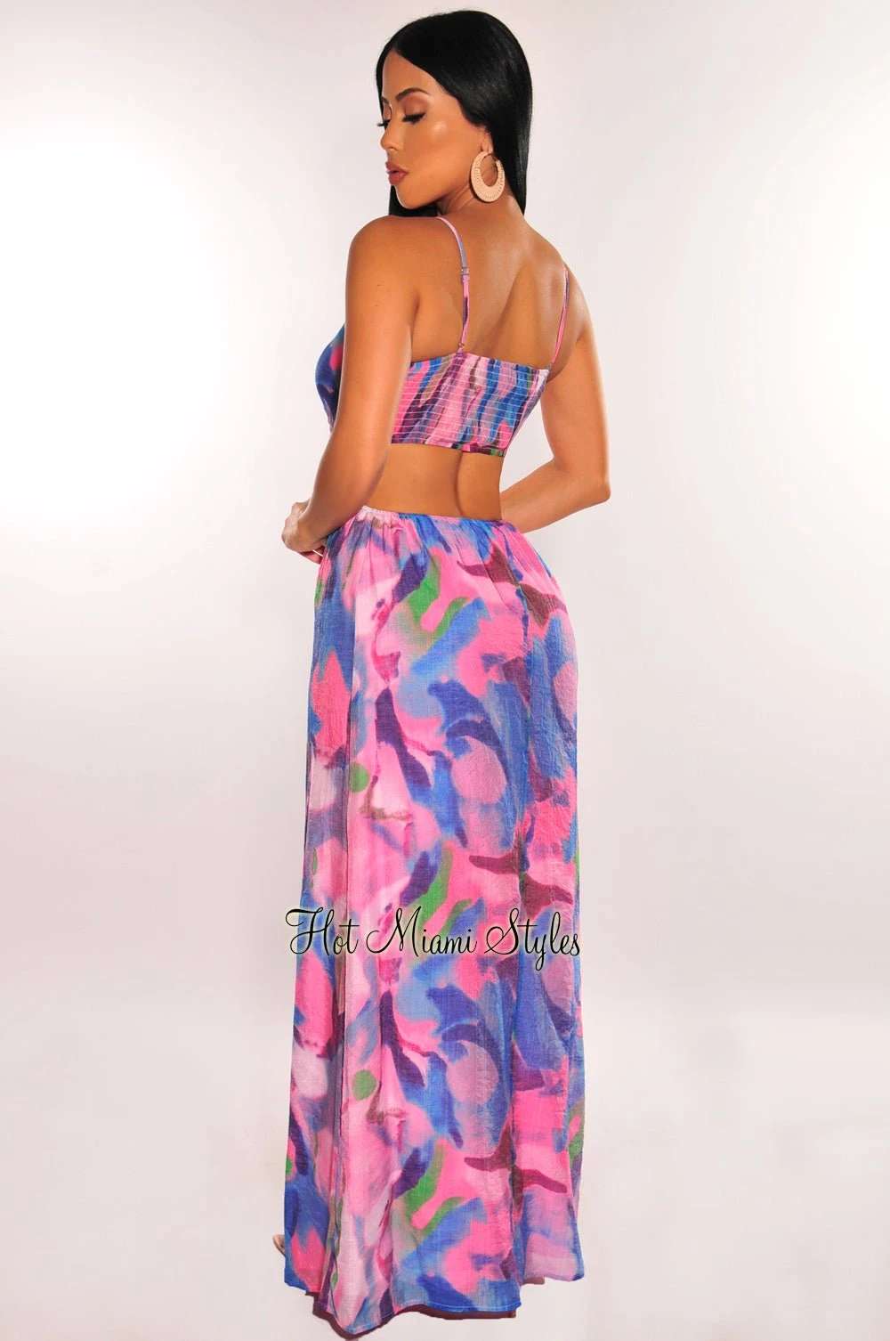 Pink Watercolor Print O Ring Cut Out Maxi Dress