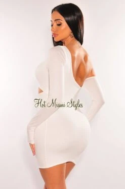 White One Shoulder Long Sleeve Drawstring Cut Out Ruched Dress