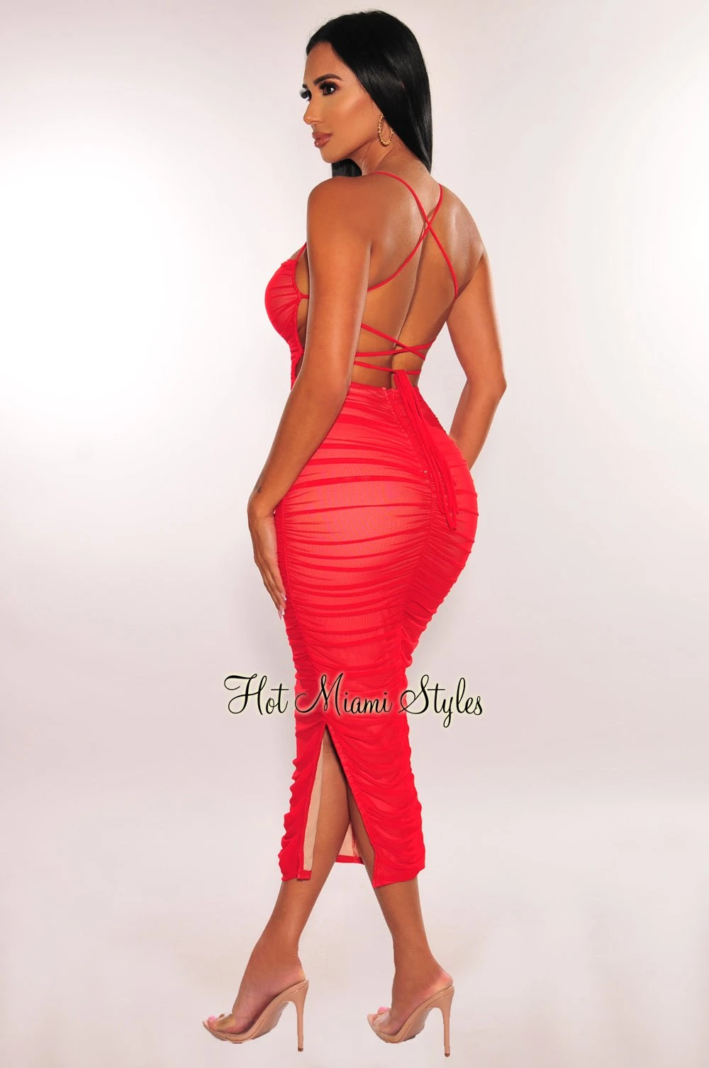 Deliver classy chic looks in this red mesh midi dress. Featuring ruching on all the right places to enhance your shape, a lace up at back and an appealing slit.