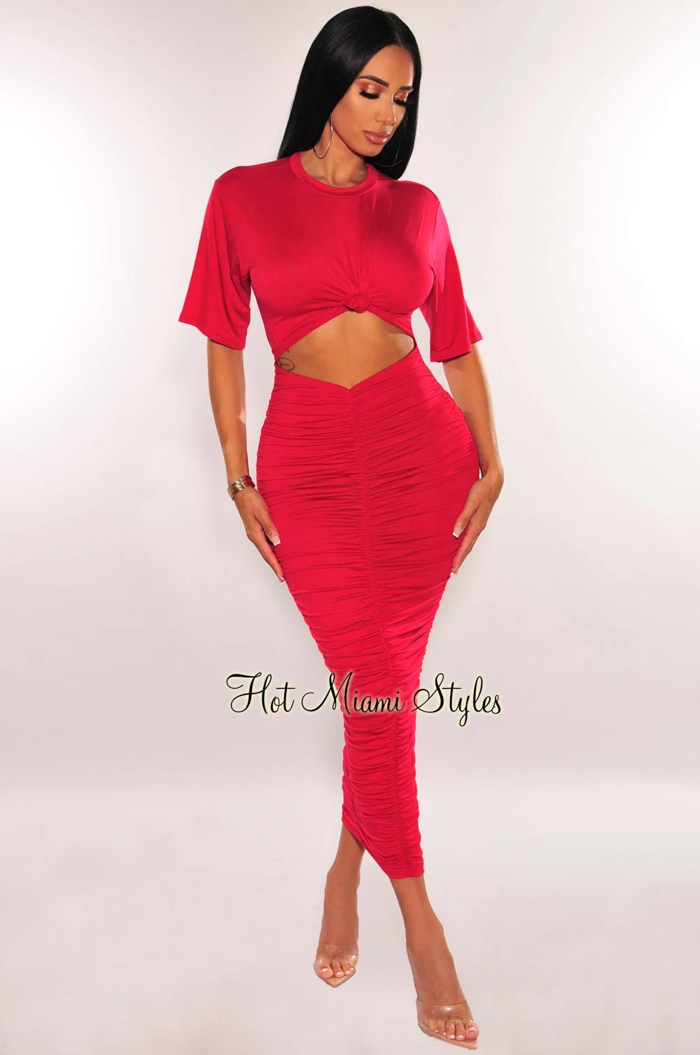 For the latest chic look you’ve been searching for. Designed with a knotted bust, cut out detail and ruching on a maxi length.