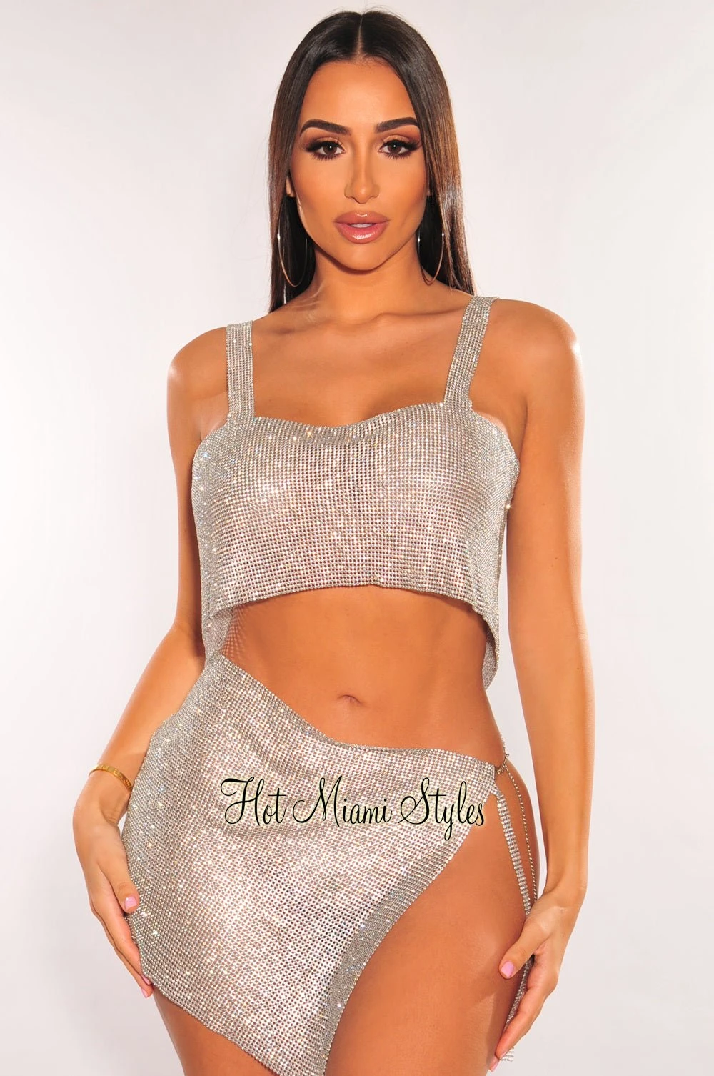 Reveal a goddess and sexy allure in this silver mesh chain top, designed in gorgeous rhinestones to make a statement.
