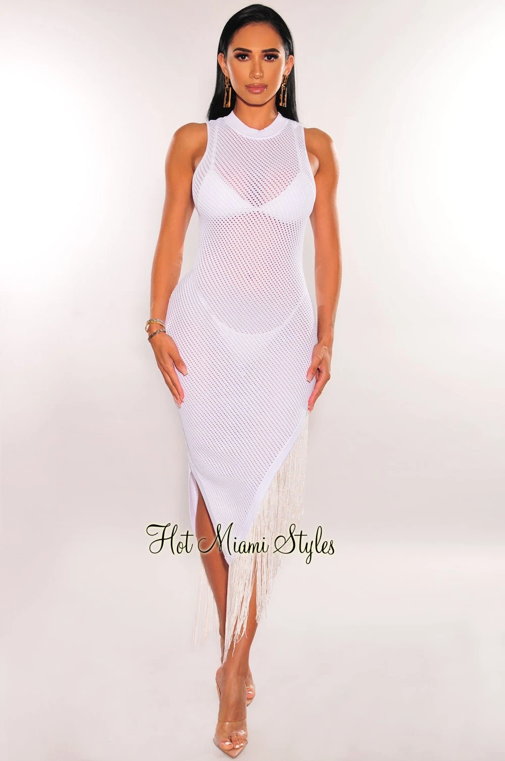 Cover up in crochet for the most luxurious look. Featuring a sheer bodice and an eye-catching fringe hem that moves beautifully as you walk.