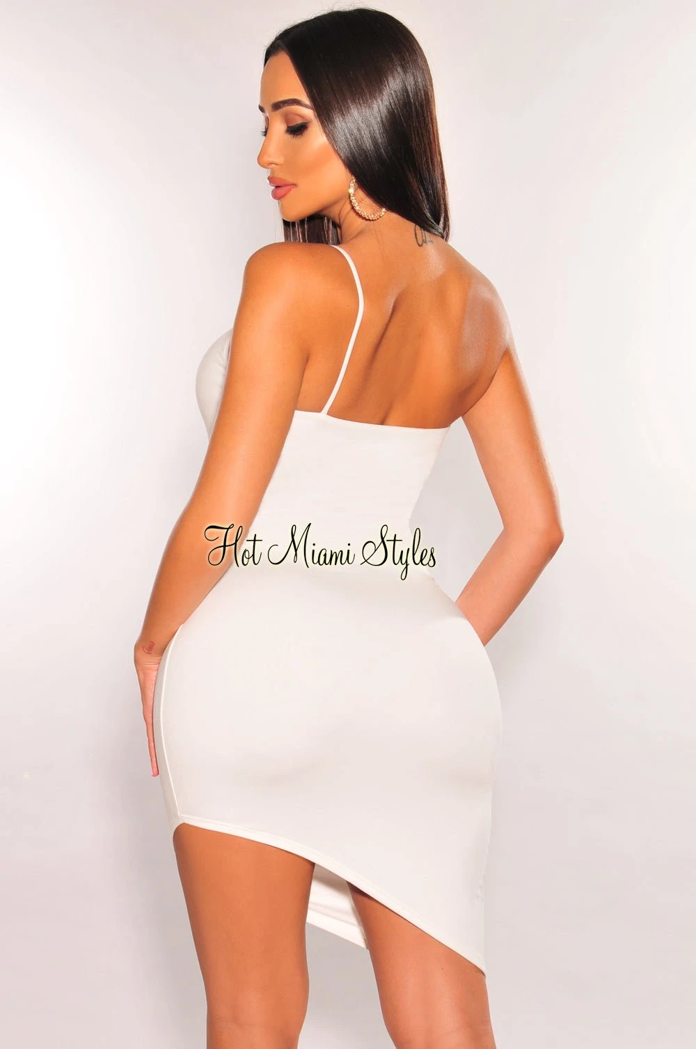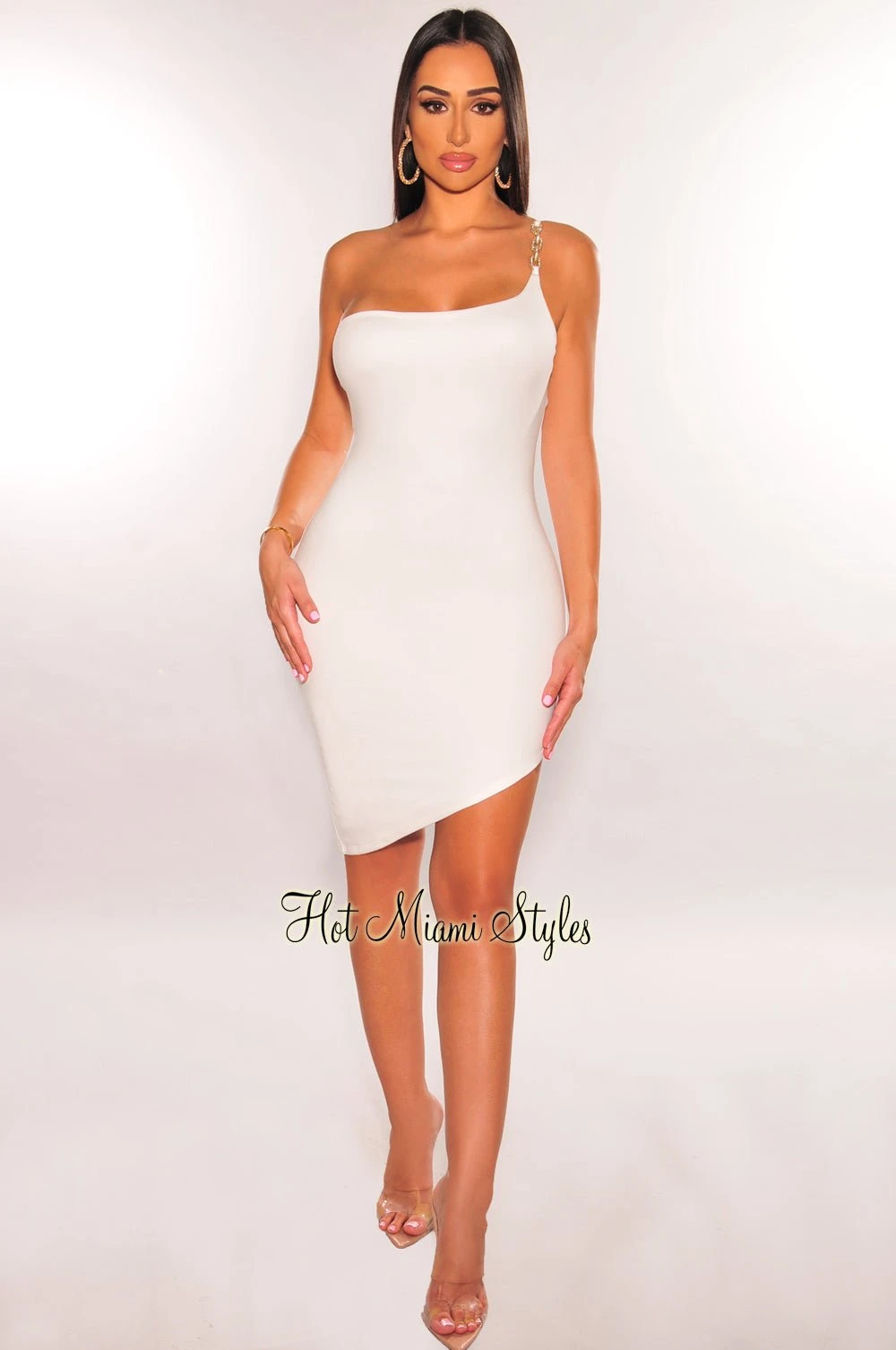 Let jaws drop in this gorgeous dress. Our white gold chain one shoulder dress is designed with an asymmetrical hem and curve hugging fit that you will love.