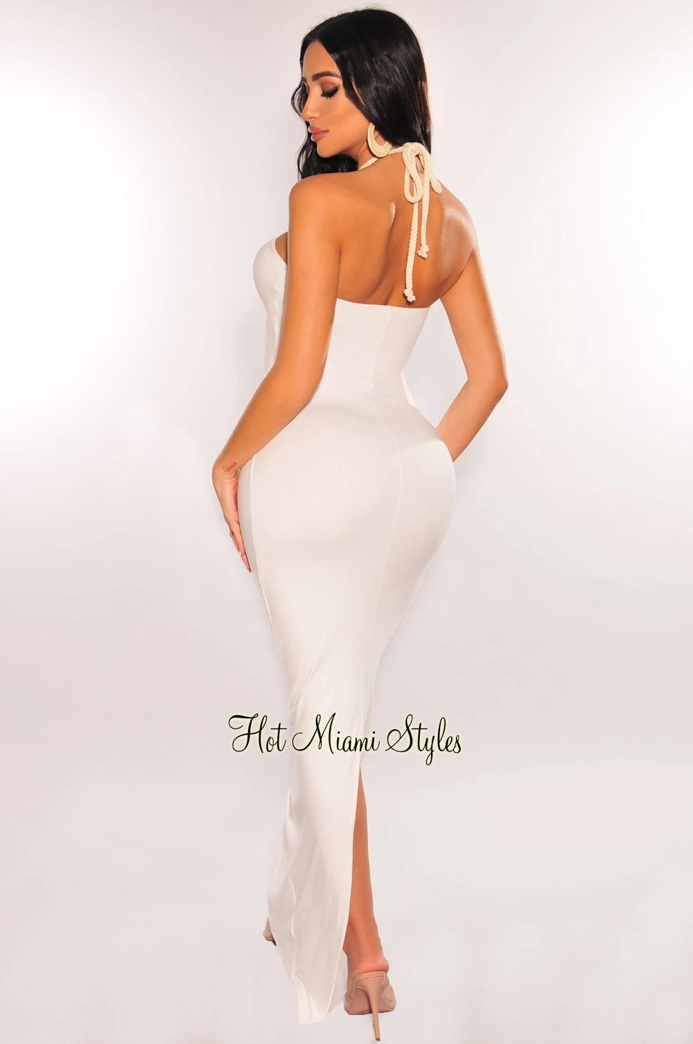 A statement-making number with a body hugging silhouette to ensure all eyes on you. Deigned on an halter neckline with braided rope and knotted cut out details on an irresistible maxi length.
