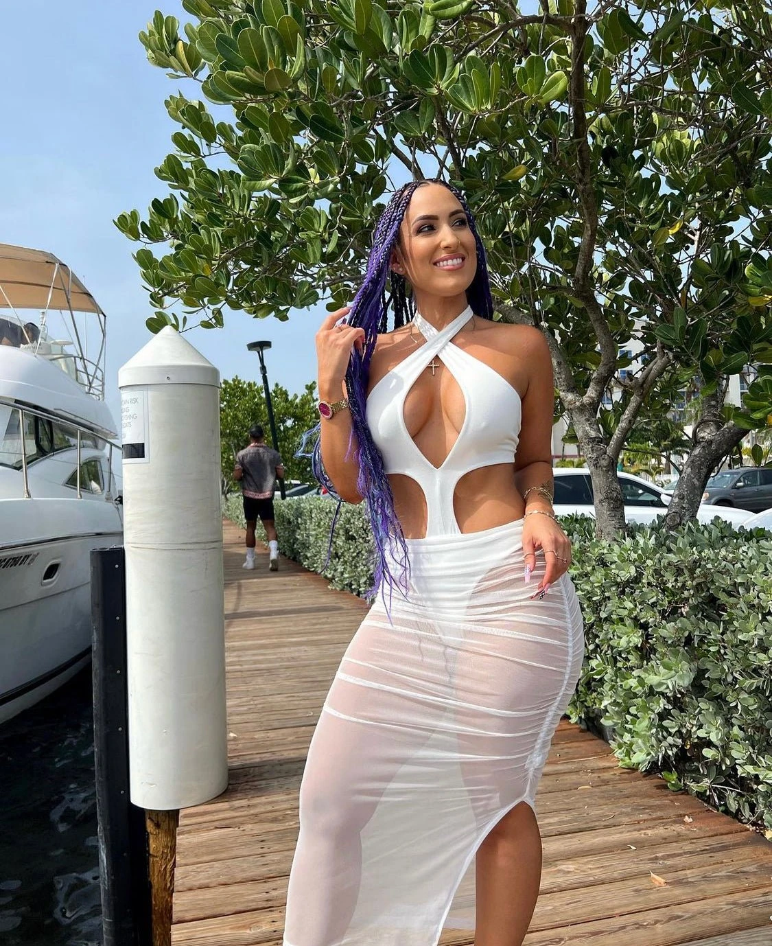 Put on this statement piece to steal the show anywhere you go! Featuring a halter crisscross neckline, on a sexy cut out design and a sheer mesh ruched slit skirt.
