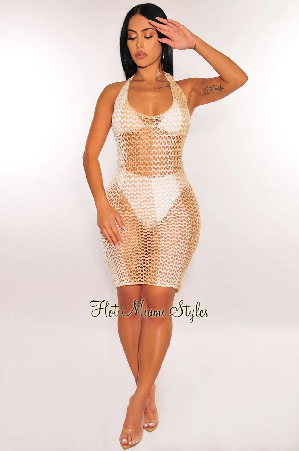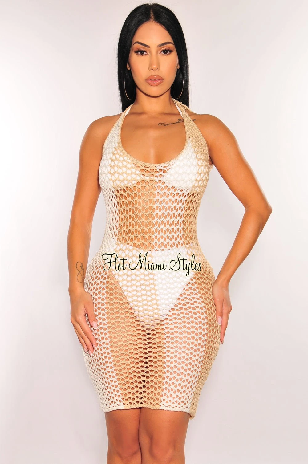 This crochet cover up is everything we are currently loving with adjustable tie up details at shoulders. Pair with your favorite HMS swimwear.